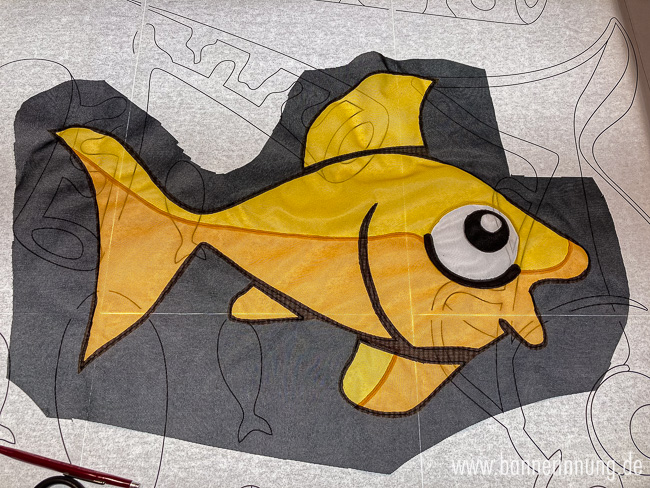 Der erste Fisch entsteht. Sämtliche Details werden erst einzeln gebaut und im Anschlus auf den Windschutz gebracht - das verkleinert die Stoffmengen unter der Nähmaschine enorm.