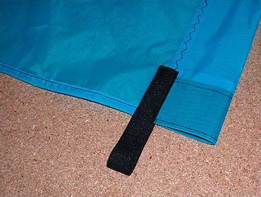 Die Leitkante wurde diesmal nicht mit Dacronlaschen, sondern einer kompletten Spinnakertasche gelöst. Das untere Ende wurde mit einer eingenähten Lage Dacron gegen Ausreißen gesichert. Mit der aufgenähten Klettbandschlaufe kann das Banner, an jeden Bodenanker angepasst, gespannt werden.