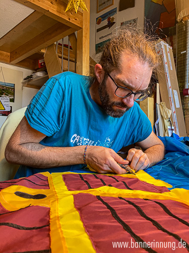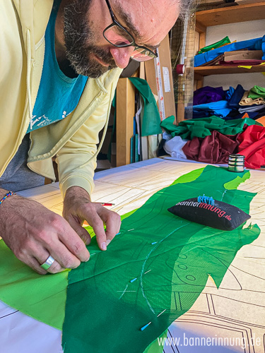 Der erste Fisch entsteht. Sämtliche Details werden erst einzeln gebaut und im Anschlus auf den Windschutz gebracht - das verkleinert die Stoffmengen unter der Nähmaschine enorm.