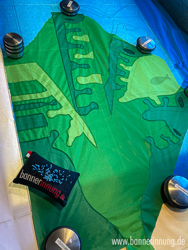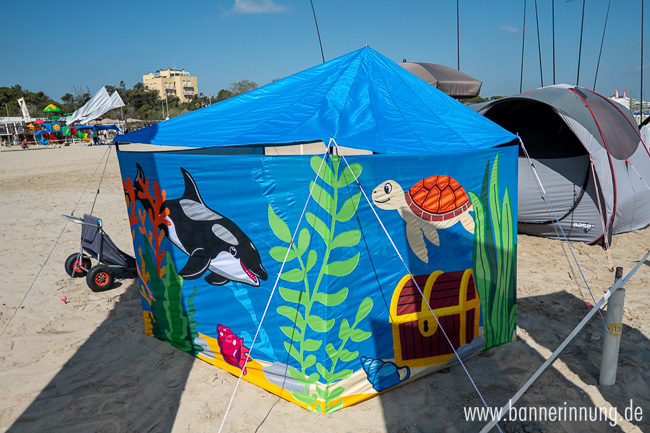 Der fertige Windschutz mit den 4 MehrMeer-Bannern. Das sieht toll aus!